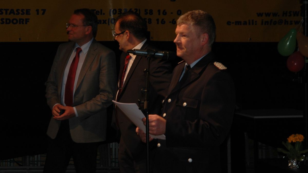 Bild (v.l.n.r.): Rolf Lindemann, Landrat; Jörg Vogelsänger, Landtagsabgeordneter für Woltersdorf; Ralph Utecht, Gemeindebrandmeister Woltersdorf