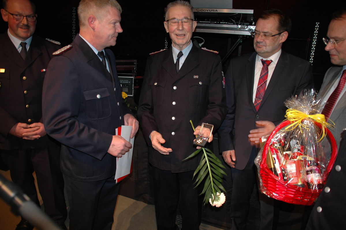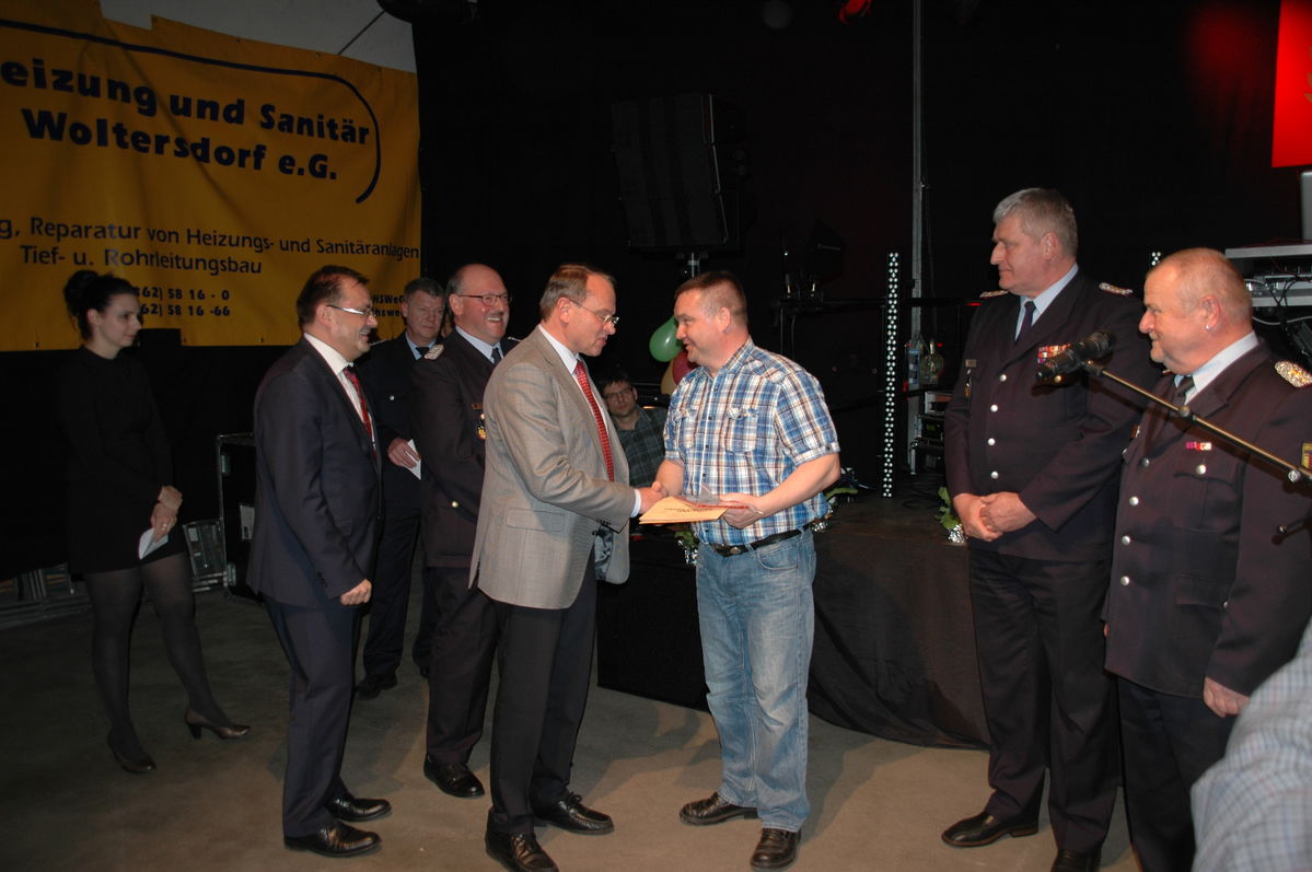 Im Anschluss ehrten Ralph Utecht, Gemeindebrandmeister, Jörg Vogelsänger und Rolf Lindemann den Kameraden Klaus Gericke und Herr Neumann. Klaus Gericke ist seit 60 Jahren Mitglied der Freiwilligen Feuerwehr Woltersdorf. Herr Neumann wurde dafür geehrt, dass er einen seiner Mitarbeiter zu jeder Tageszeit von seiner Arbeit freistellt, um in den Einsatz fahren zu können.