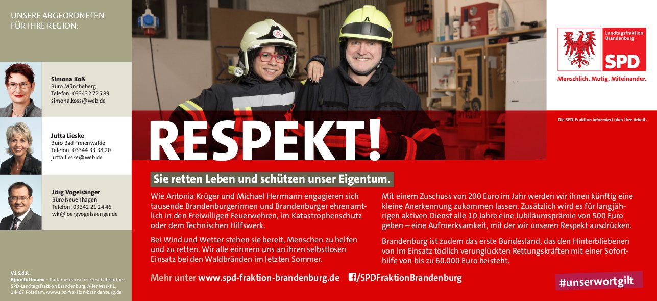 Rund 38.000 Frauen und Männer in Brandenburg engagieren sich aktiv in der Freiwilligen Feuerwehr. Darüberhinaus engagieren sich ehrenamtliche Helferinnen und Helfer bei den Organisationen Deutsches Rotes Kreuz, Technisches Hilfswerk, Arbeiter-Samariter-Bund, Johanniter-Unfallhilfe, Deutsche Lebensrettungsgesellschaft und Malteser Hilfsdienst und leisten wichtige Beträge zur Sicherheit jedes einzelnen. Dieses ehrenamtliche Engagement will das Land Brandenburg auf Initiative der SPD nun stärker anerkennen und fördern: Der Landtag berät diese Woche über das Prämien- und Ehrenzeichengesetz, das jährliche Zuschüsse von 200 Euro und eine Prämie für langfristige Einsatz von 500 Euro vorsieht.