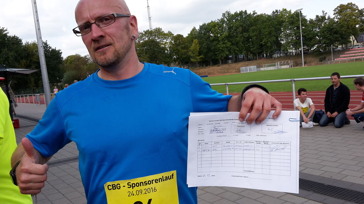 Der trainierte Sportlehrer tat das und lief mit viel Elan gegen die Zeit. Der Spott der Schüler von Jens Geiseler blieb also aus! Mit beachtlichen 45 Runden bzw. 18 gelaufenen Kilometern hat er in den zwei Stunden auch einen ansehnlichen Betrag erlaufen.