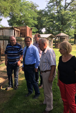 Beim Rundgang: Eckhard Peetz, Jörg Vogelsänger, Stephen Ruebsam SPD-Bundestagskandidat, Tierarzt und Gehegechef Wilfried Böttcher, Jutta Werbelow, Bürgermeisterkandidatin der SPD-Wriezen (v.l.) im Wriezener Wildgehege