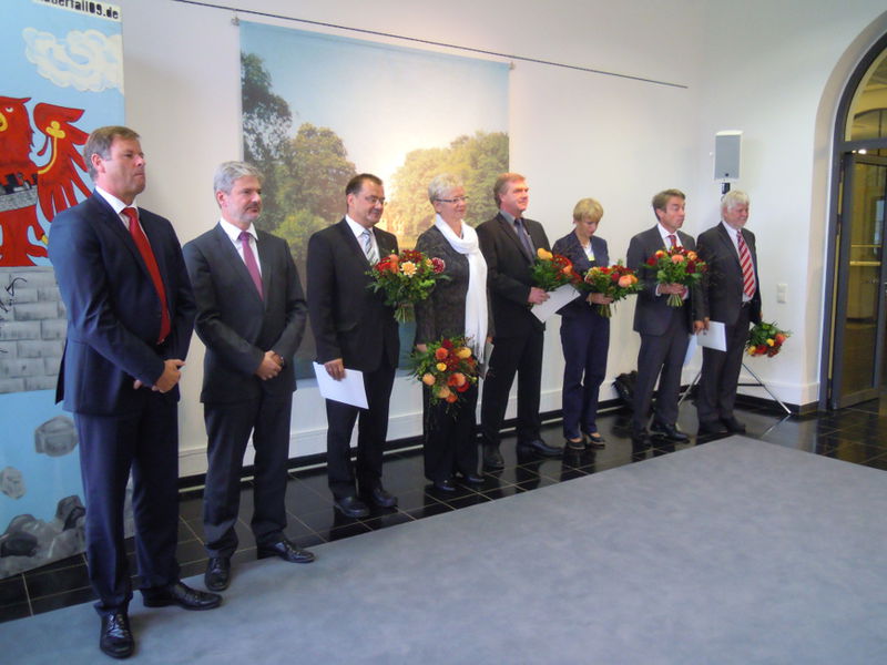 Geschlossen nimmt das alte Kabinett der Brandenburger Regierung die Entlassungsurkunden entgegen. Ministerpräsident Dietmar Woidke hat sie gerade überreicht. Die Minister, so auch Agrar- und  Infrastrukturminister Jörg Vogelsänger ( siehe Bild , 3. von links), bleiben aber übergangsweise im Amt. Bis der neue Ministerpräsident gewählt wird, sein neues Kabinett vorstellt und es vereidigt wird. Das gehört zum Ritual, wenn ein neuer Landtag, wie heute am 8. Oktober 2014, zu seiner ersten konstituierenden Sitzung zusammentritt.