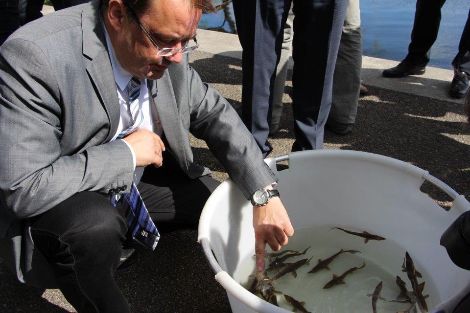 Brandenburgs Agrar- und Umweltminister Jörg Vogelsänger hat gemeinsam mit Potsdams Oberbürgermeister Jann Jakobs, Jörn Gessner vom Leibniz-Institut für Gewässerökologie und Binnenfischerei sowie zahlreichen Potsdamer Schülern 250 junge Störe in der Havel ausgesetzt. Von dort treten die Fische ihre große Reise in Richtung Nordsee an.