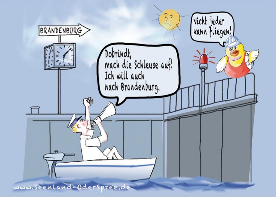 Kurz nach 18:00 an einer Brandenburger Schleuse! Der Bootsführer ruft übers Megaphon: „Dobrindt, mach die Schleuse auf! Ich will nach Brandenburg.“ Eine Karikatur, gedruckt auf 5000 Postkarten. Der Tourismusverband Seenland Oder-Spree setzt damit den Kampf um eine Verlängerung der Schleusen-Öffnungszeiten in den Storkower Gewässern unverdrossen fort. (Siehe: Brandenburgs Forstleute als Schleusenwärter)