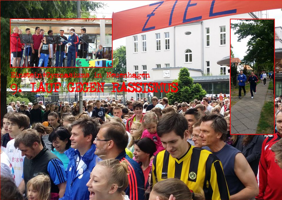 Der Lauf gegen Rassismus des Einstein-Gymnasiums in Neuenhagen (EGN) hat inzwischen einen festen Platz im Ort. Seit nunmehr neun Jahren findet er jährlich im Mai statt. Jörg Vogelsänger, MdL und Minister für Landwirtschaft, Umwelt und Ländliche Entwicklung begrüßte am Sonnabend, 30. Mai 2015 nicht nur die Läufer, sondern legte die rund 3,5 Kilometer lange Strecke selbst zurück: Es ging von der Schule in der Dahlwitzer Straße bis zum Rathaus und wieder zurück. Er schaffte es mit dem Genossen Moritz Felgner (kl. Bild, oben) sogar unter die ersten 50 Teilnehmer (Bild im Bild rechts). Moritz Felgner hat mit seinem Fußballverein, dem Blau-Weiß Waldesruh, eine Mannschaft zum Lauf angemeldet, die sich aus Flüchtlingen formiert hat. Der Verein betreut diese, um ihnen einen Zugang zur Gesellschaft in Deutschland zu verschaffen. (Bild im Bild links: Jörg Vogelsänger überreicht eine Spende)