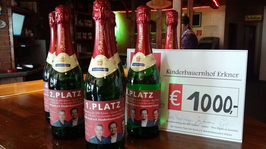 Beim Benefizbowling der SPD Erkner – Gosen-Neu Zittau, diesmal zu Gunsten des Vereins Kinderbauernhof Erkner „Tiere für Euch e.V.“, kamen am Sonnabend, den 18.03.2017, 1000 Euro zusammen. Rekord. Die Spende übergab Jörg Vogelsänger vor Ort an den Verein. Mit dabei die SPD-Kandidaten für den Bundestagswahlkampf und die Bürgermeisterwahlen.