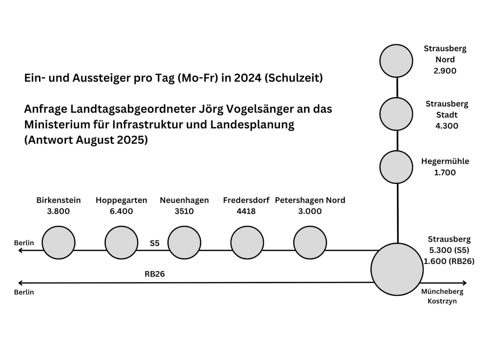 Die S-Bahn ist und bleibt das wichtigste ÖPNV-Angebot in der S5 Region. Die Zahlen Passagieren pro Tag (Montag bis Freitag, Schulzeit) im Jahr 2024 verdeutlichen das. Über 35.000 Ein- und Aussteiger bei der S-Bahn 5 in Märkisch-Oderland melden die Verkehrsbetriebe. Das gab das Brandenburger Verkehrsministerium auf Anfrage bekannt.