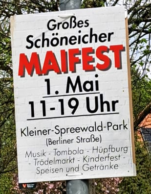 Stellvertretend für die vielen Maifeste in der Region, sei hier das Ereignis von Schöneiche erwähnt. Im Kleinen-Spreewald-Park an der Berliner Straße von 11:00 bis 17:00 Uhr. Viel Spaß