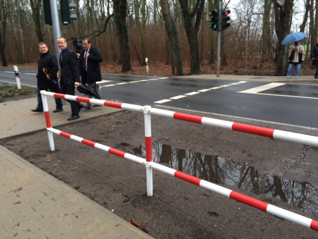Drei Herren in dunklen Anzüge überquerten am 21.12.2015, Montag Vormittag einen Fußgänger-Übergang. Genauer gesagt: die frisch eingeweihte Ampelanlage an der Straßengabelung Köpenicker Allee/Friedrichshagener Chaussee südlich der B1/B5. Die Namen der Fußgänger: Stefan Radach (v.l.n.r.) , Ortsbeirat von Dahlewitz-Hoppegarten, Karsten Knobbe, Bürgermeister Hoppegarten und Jörg Vogelsänger, MdL-Brandenburg SPD.