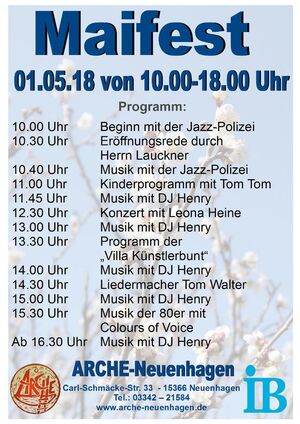 Die ARCHE-Neuenhagen lädt am 1. Mai herzlich zum traditionellen Maifest ein. Das Maifest, ein Familienfest mit vielen tollen Angeboten für Kinder (Streichelzoo der "Rollenden ARCHE", Kinderschminken, Korbflechten, Basteln, Hüpfburg, Karussell, Graffiti, u.s.w.), einem vergnüglichen und abwechslungsreichen Bühnenprogramm sowie mit diversen kulinarischen Köstlichkeiten vom Grill, aus Topf und Pfanne, leckerer Maibowle und selbst gebackenem Kuchen.