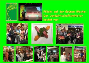 Hier ein Häppchen, da ein Schlückchen! Herr Minister, bitte hierher schauen! Bitte Lächeln! Danke auf zum nächsten Aussteller. Fotografen riefen und die Kameras blitzten. Austeller präsentierten ihre Leckerbissen. Genau 79 Stände besuchte Landwirtschaftsminister Jörg Vogelsänger am Vortag der Eröffnung der Internationalen Grünen Woche am Messegelände in der Brandenburghalle ( 21A, vom Nordeingang über die Masurenallee am besten zu erreichen). Die Journalisten begleiteten ihn auf der Pflichttour als Vorkoster für die Brandenburger.