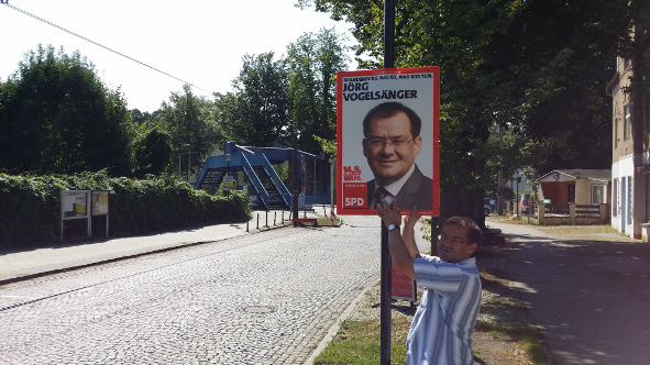 Die ersten Plakate werben schon für die Kandidaten des neuen Brandenburger Landtages, der am 14. September 2014 gewählt wird. In seinem Wahlkreis 31 haben Jörg Vogelsänger und sein Team begonnen, die Schilder der Sozialdemokraten an den Laternenmasten, hier an der Haltestelle der Straßenbahn "Woltersdorfer Schleuse", anzubringen.